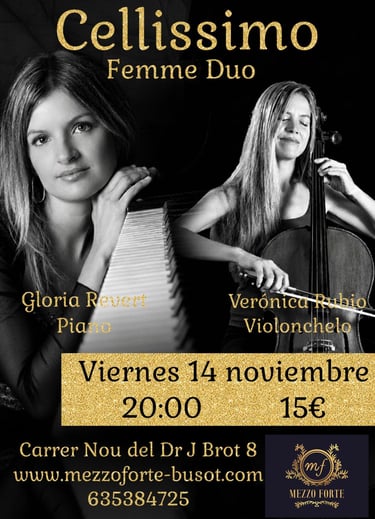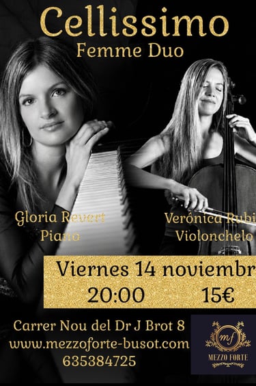 Femme Duo, formado por la talentosa violonchelista Verónica Rubio y la virtuosa pianista Gloria Revert, es una celebración del papel femenino en la música clásica. A través de su cautivadora interpretación, ambas artistas destacan la fuerza y sensibilidad que las mujeres aportan al arte musical. Su repertorio abarca piezas de compositoras históricas y contemporáneas, resaltando la creatividad femenina a lo largo de los siglos. Femme Dúo no solo ofrece un deleite auditivo, sino que también inspira a nuevas generaciones de mujeres a explorar y ocupar espacios en el mundo de la música. Una experiencia única que empodera y transforma.